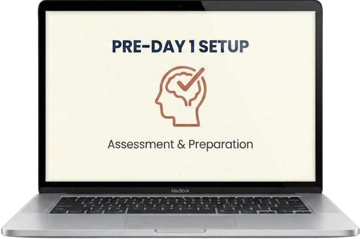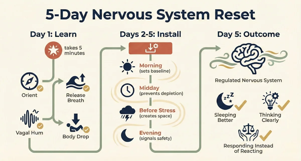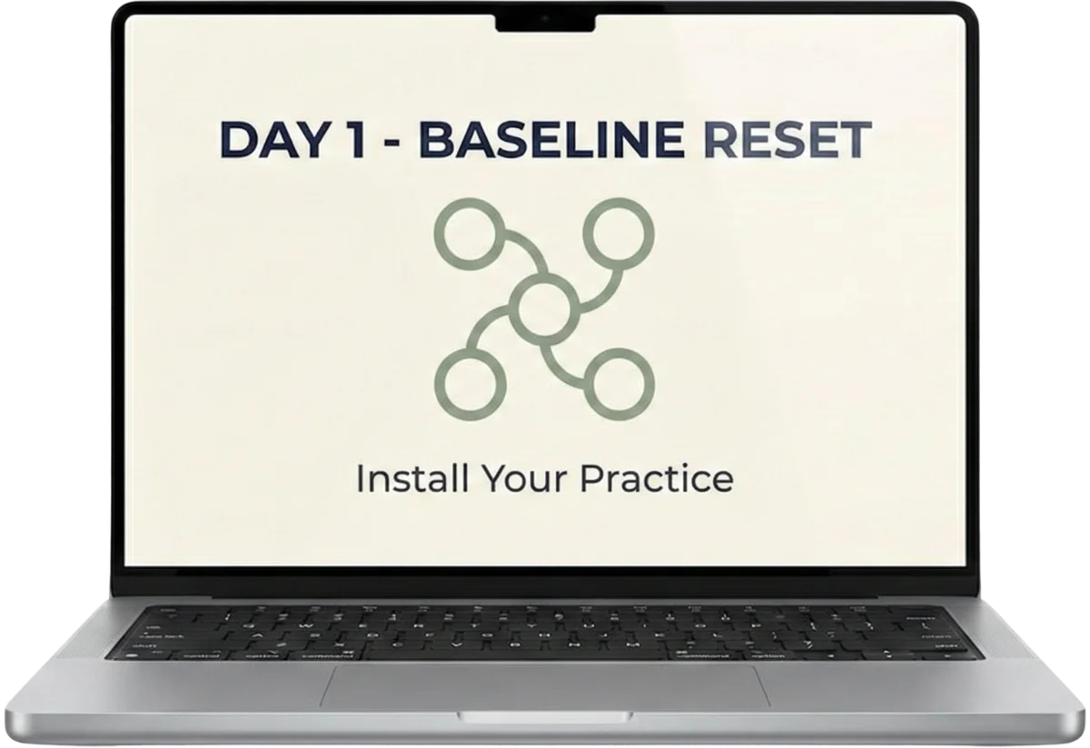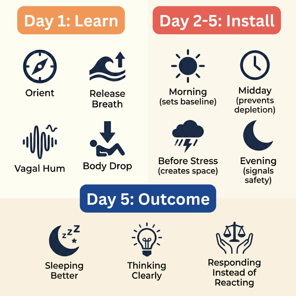 Day 1 installs the Baseline Reset Practice – the one protocol you'll use all week. Four components (Orient, Release Breath, Vagal Hum, Body Drop) that take 5 minutes total.