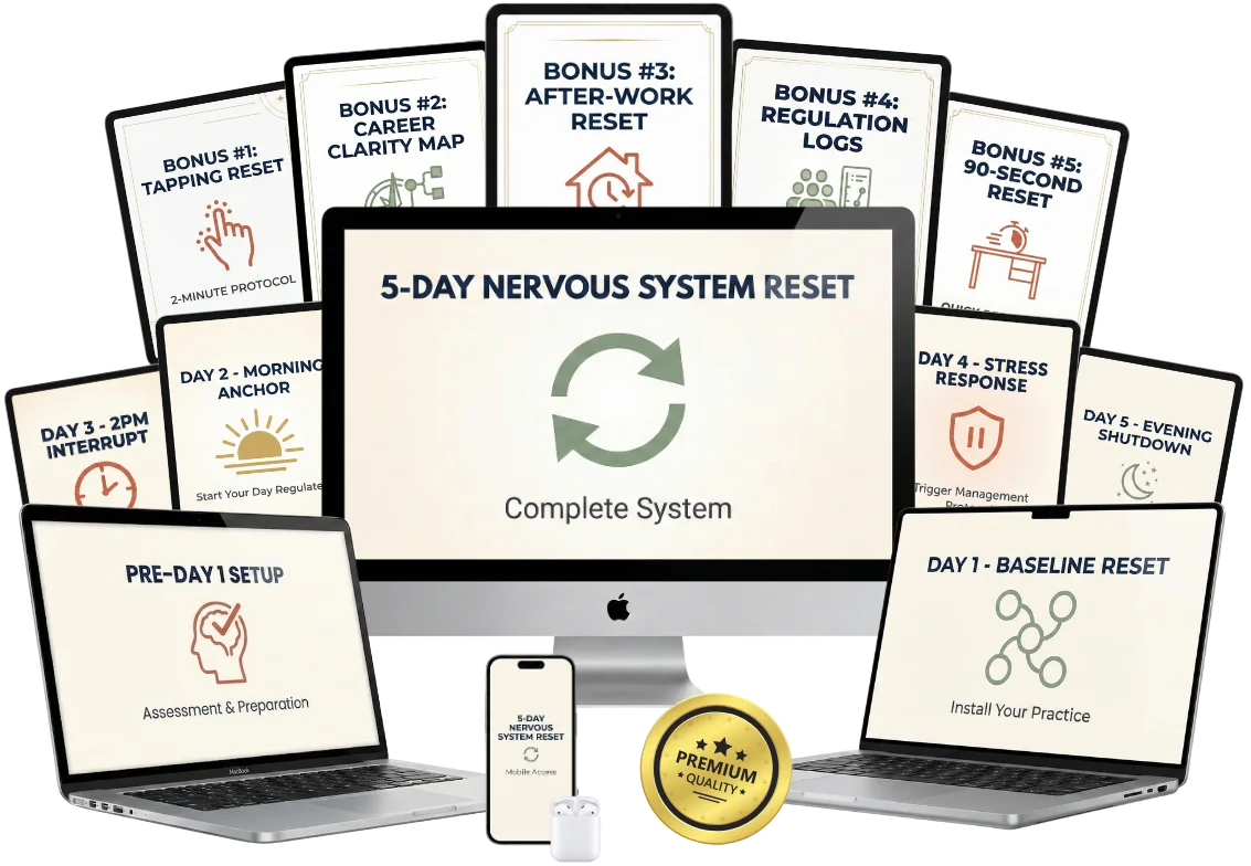 You're getting the complete 5-Day Nervous System Reset system with daily videos, practices, and trackers – PLUS 5 bonuses including the 2-Minute Tapping Reset Protocol, Career Clarity Map, After-Work + Weekend Reset Ritual, Real Accountant Regulation Logs, and 90-Second Desk Reset Protocol.