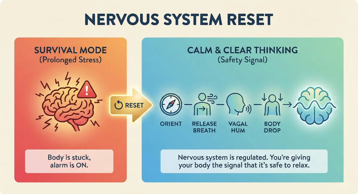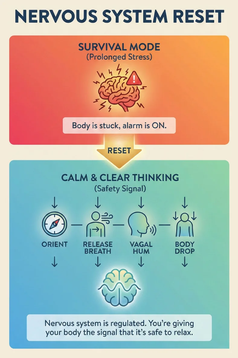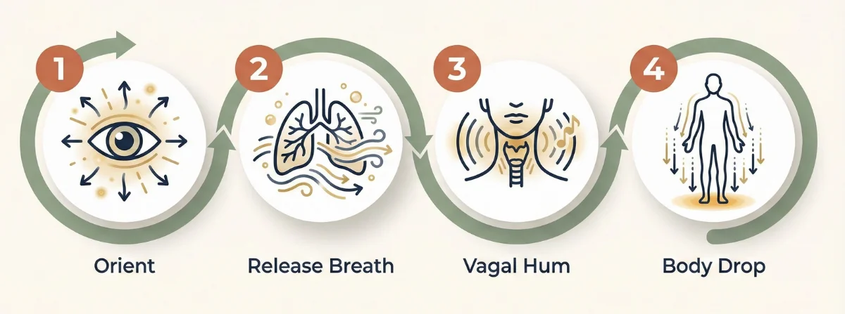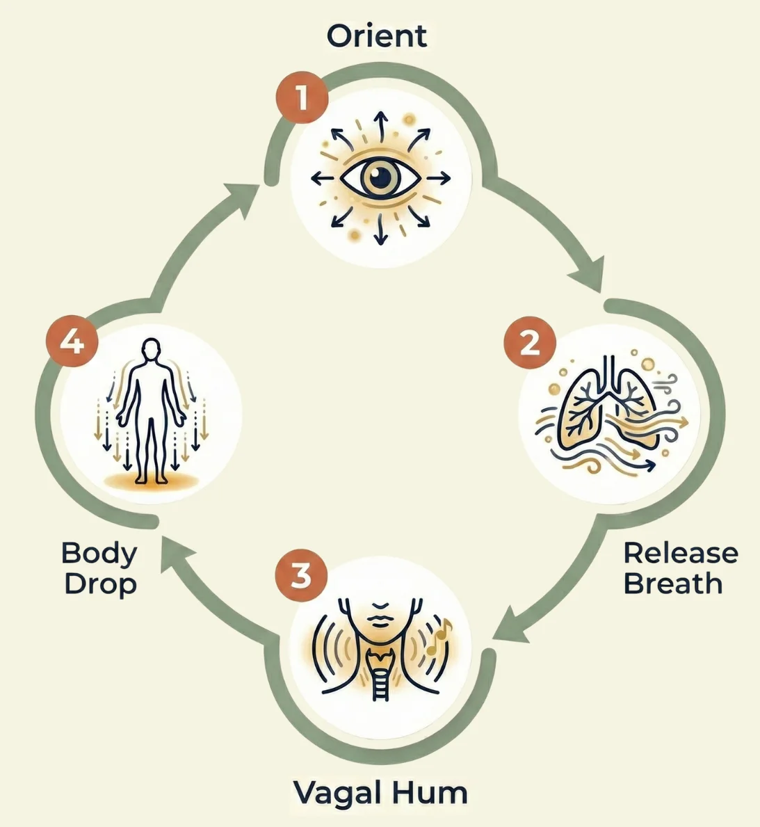 The Orient component grounds you in the present. The Release Breath activates your parasympathetic nervous system (rest mode). The Vagal Hum stimulates your vagus nerve (the key to regulation). The Body Drop releases physical tension stored from chronic stress.