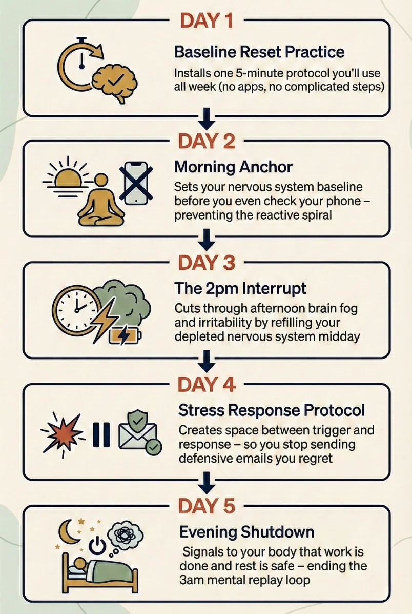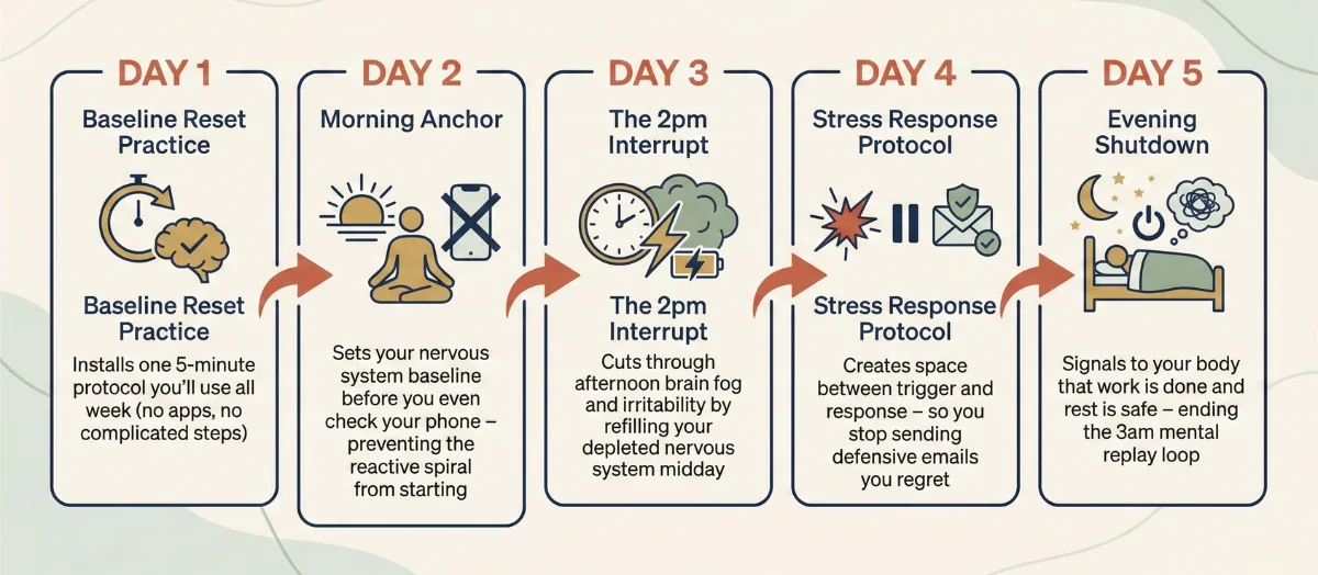 Then Days 2-5 install that practice at the exact moments your nervous system needs it: morning (sets baseline), midday (prevents depletion), before stress (creates space), evening (signals safety).