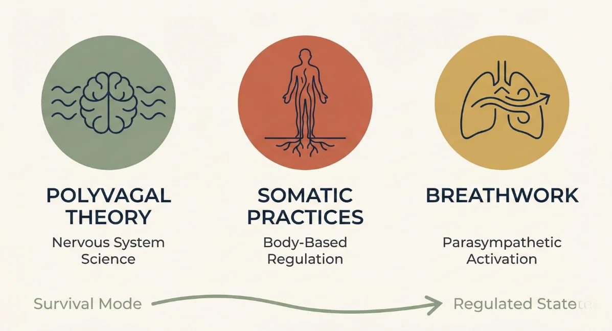 It combines proven frameworks – polyvagal theory (nervous system science) and somatic practices (body-based regulation) – into one efficient system that works for people with your exact schedule and stress triggers.