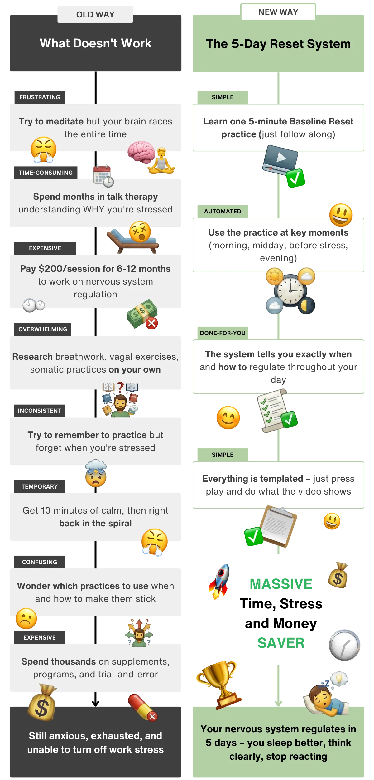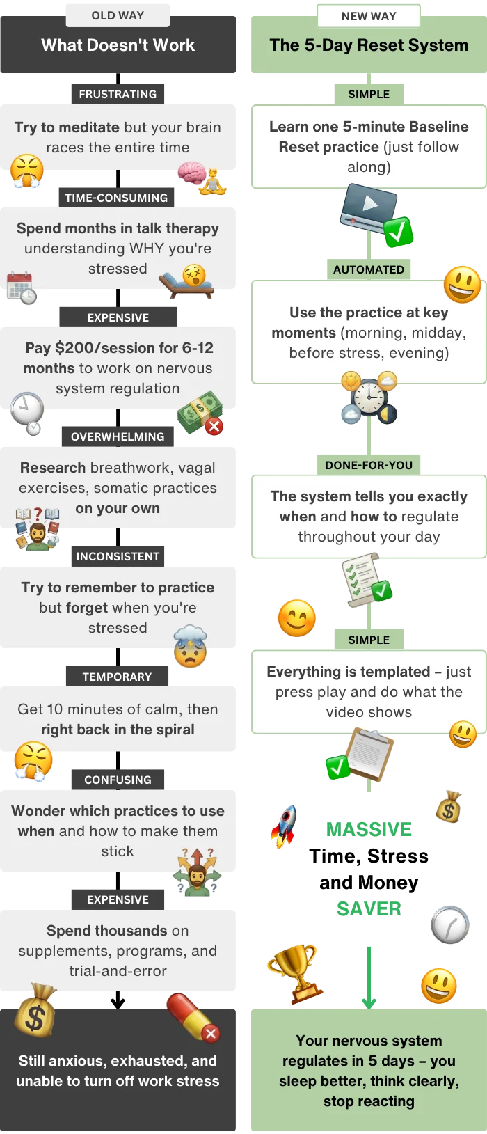 This system is different because it does BOTH: it gives you immediate nervous system regulation (you'll feel calmer within 5 days) AND it's designed specifically for high-performers who need practices that fit their schedule.